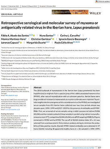 During the laboratory investigations of wild leporids found dead in Portugal carried out within the scope of a Nacional Surveillance Plan (Dispatch 4757/17, MAFDR), co-infection events by classic (MYXV) and naturally recombinant (ha-MYXV) strains were detected in both one Iberian hare and one European wild rabbit (Oryctolagus cuniculus algirus). These two cases were initially detected by a multiplex qPCR detection of MYXV and ha-MYXV and subsequently confirmed by conventional PCR and sequencing of the M009L gene, which contains an ha-MYXV-specific insertion.